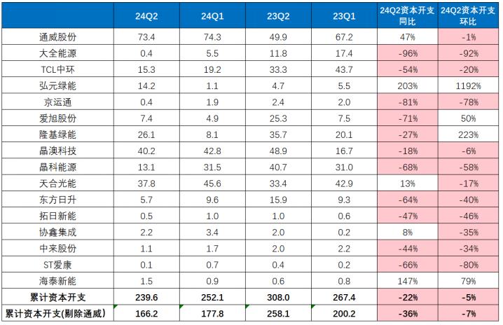 结构上,硅料环节,大全能源已经基本停止扩产,但通威依然在扩张硅料产能;硅片环节整体削减资本开支意愿较强,如京运通也在Q2几乎停止资本开支,中环股份Q2同比下降54%;电池片环节,通威股份仍在大幅扩产,爱旭股份资本开支同比下滑71%;组件环节,天合光能资本开支与去年同期比基本接近;一体化企业中,隆基、晶澳、晶科资本开支同比也均有所下降。