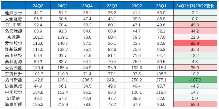 硅片企业的存货周转天数一般在3个月左右,这意味着硅片企业本季度销售的硅片,有相当部分的硅料原材料的采购发生在上个季度,甚至是前几个季度。由于硅料、硅片价格的下跌主要发生在二季度,这意味着硅片企业在Q2形成了低价硅片(产品降价)+高价硅料(成本提升)的组合,因此Q2硅片企业毛利率普遍为负数环比大幅下滑,形成巨额亏损。