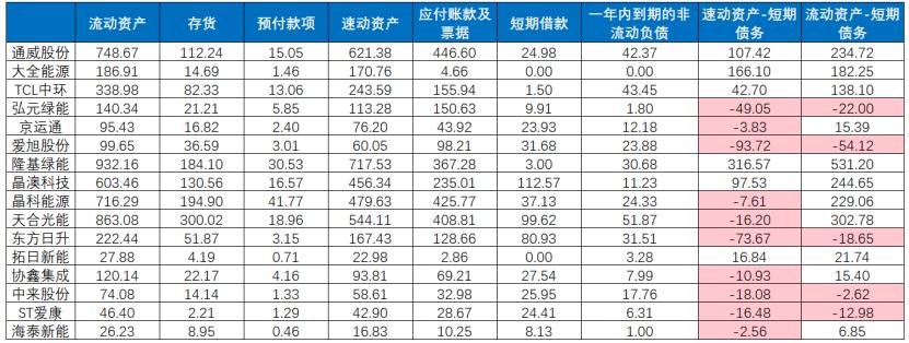 当然,如果将存货的变现也考虑在内,只用流动资产-短期债务的方式衡量相关企业的偿债能力,除弘元绿能、爱旭股份、东方日升外,其他的几家大型上市光伏企业表现均较好。