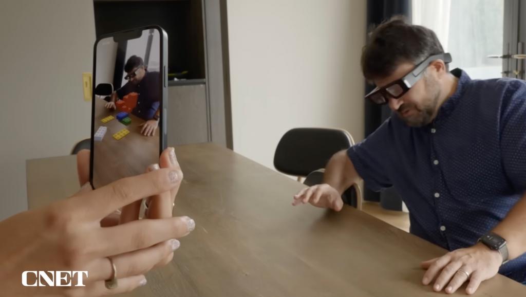 CNET 评测者和一名 Snap 团队的成员尝试了使用 Spectacles 进行协作,眼镜可以识别附近的另一位佩戴者,然后进行体验的共享,并且还会利用多个摄像头,把房间扫描成一个混合现实的网格。
