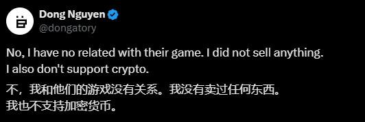 消息传出后,阮哈东本人突然在社交媒体上发布了澄清内容,表示他与该游戏没有一点关系,他自己也不会支持加密货币。