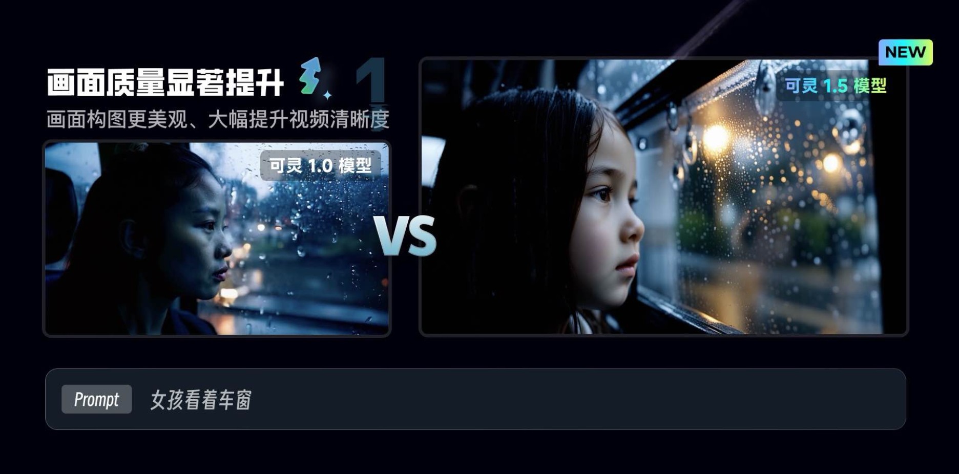 此前,可灵1.0模型在高品质模式可生成720p视频,本次升级后,1.5模型高品质模式可直接生成1080p高清视频。通过输入提示词“女孩看着车窗”,对比左右两个版本视频生成的效果,可以发现,可灵1.5新模型的画面质量提升显著:画面清晰度有直观可感,画面右侧的女孩面部细节更清晰丰富,车窗的水雾、整体光影表现等也都更加出色。同时,新模型下画面整体构图也进一步优化,画面更具美感。