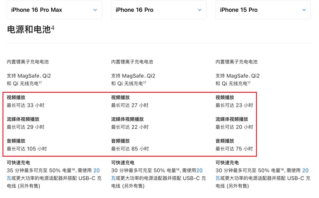虽然充电纯属小插曲,但电池这回确实是实打实地变大了—— iPhone 16 Pro 从前代的 3275mAh 增加到了 3594mAh ( 13.942Wh ), iPhone 16 Pro Max 从前代的 4422mAh 增加到了 4640mAh ( 17.955Wh )。