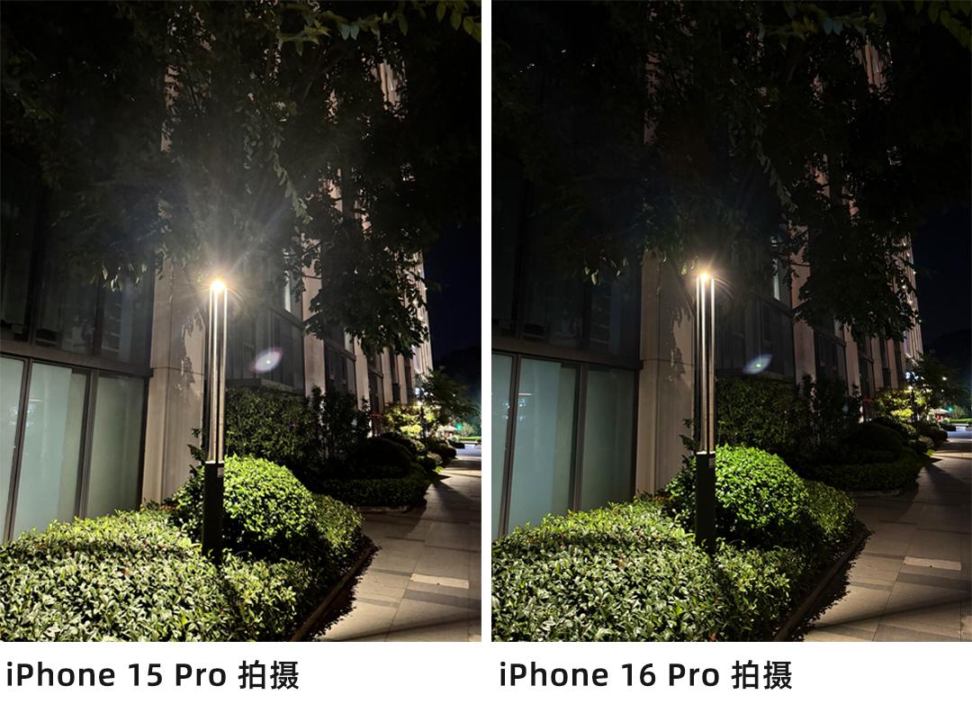 你们看哈, iPhone 15 Pro 拍摄的样张中,光晕非常强烈;相比之下, iPhone 16 Pro 的光晕会相对不那么明显,并且整个画面的纯净度有很大改善,但是也跟 iPhone 15 Pro 一样存在鬼影现象。