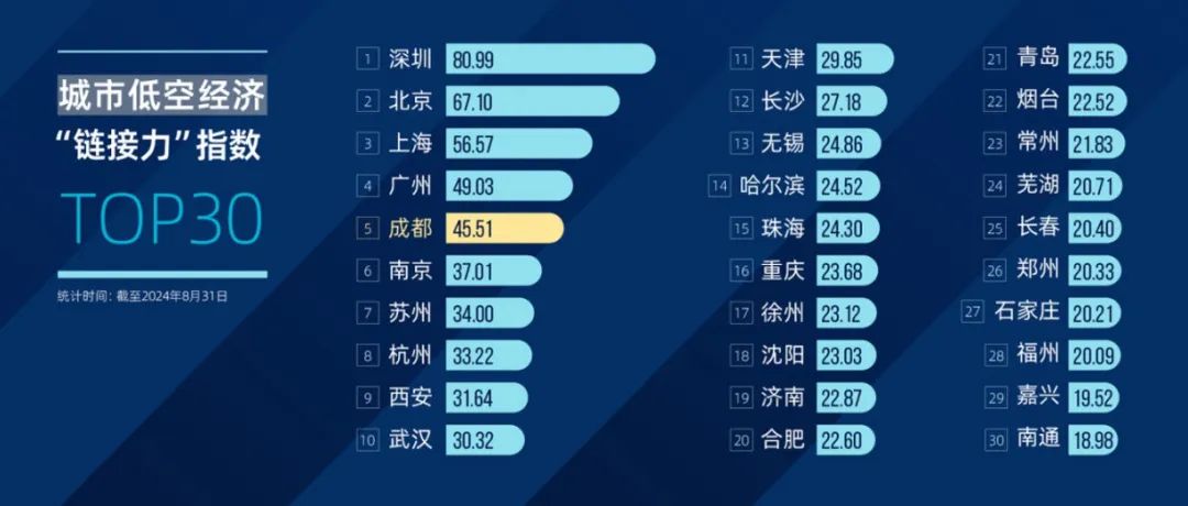 《报告》显示,深圳、北京作为头雁领跑,成都与上海、广州紧随其后,与其他城市拉开明显差距,正在加速竞逐“天空之城”。