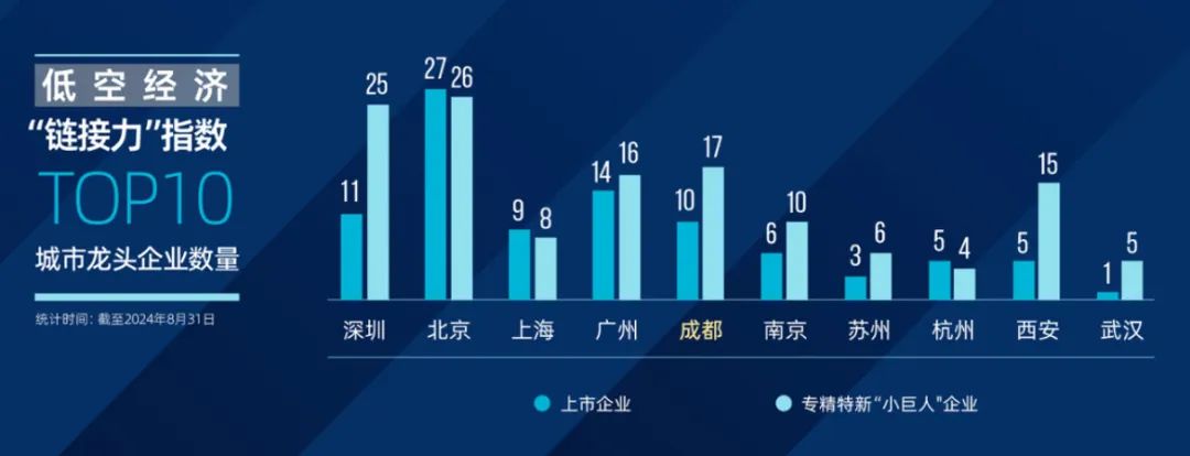 从上市企业数量来看,成都有10家,在低空经济“链接力”指数前十城市中排名第四,仅次于北京(27家)、广州(14家)及深圳(11家);从专精特新“小巨人”企业数量来看,成都有17家,排名第三,居北京(26家)、深圳(25家)之后,优势更为突出。