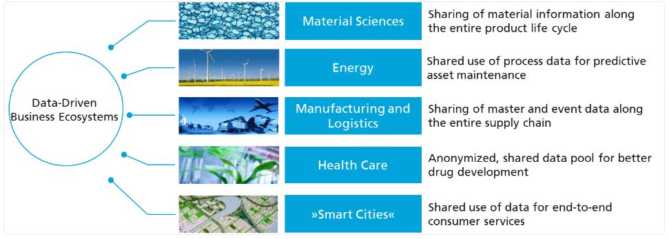 数据驱动的商业生态系统是一个以数据为战略资源,由成员共同创造创新价值的生态系统。成功的关键在于在这样的生态系统中共享和共同维护数据,因为只有合作伙伴合作并共同利用其数据资源,才能实现端到端的客户流程支持(如下图中的多个示例所示)。