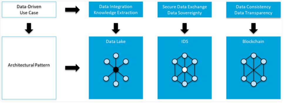 总体而言,区块链技术可以保证数据的一致性和透明性,结合通用的IDS方法可以实现数据主权和安全的数据交换和共享。而典型的数据湖则侧重于数据集成,以实现知识提取的目的(见下图)。