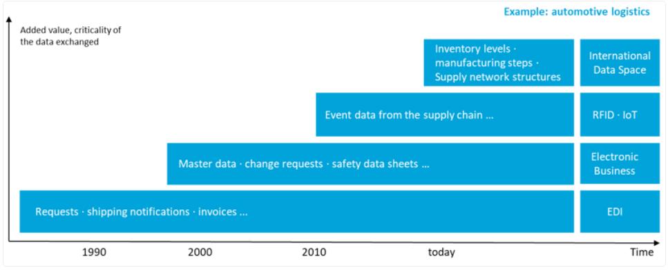 上图以汽车物流为例,展示了自 1980 年代以来数据交换技术标准的演变。数据主权是国际数据空间的主要目标之一,它体现在与数据交换和共享之前相关的“条款和条件”中。然而,这些条款和条件(如生存时间、转发权、定价信息等)尚未标准化。为了促进商业生态系统内数据交换中数据主权的建立,需要开展更多的标准化活动。