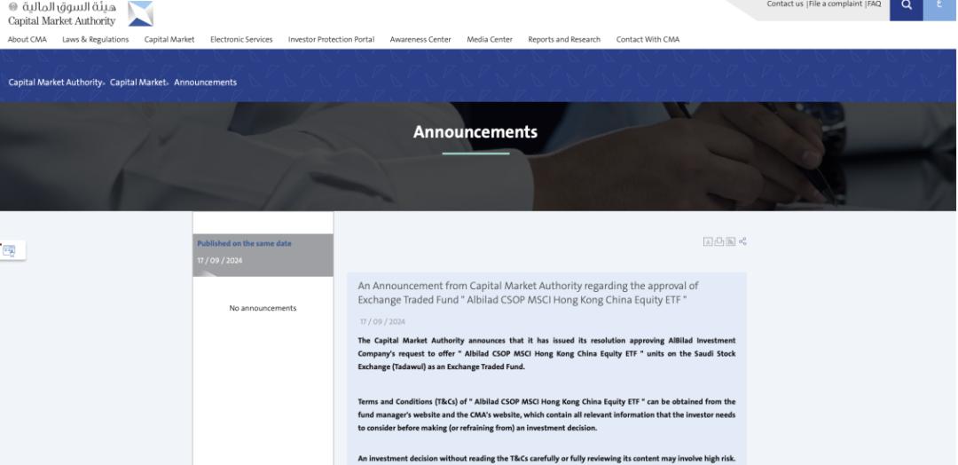 沙特资本市场管理局日前在官网宣布,已批准一只投资中国香港上市股票的ETF。该ETF由阿尔比拉德银行(Bank Albilad)的证券部门阿尔比拉德资本(Albilad Capital)管理,ETF追踪中国香港股票指数,拟于沙特交易所上市。资本市场管理局(CMA)为沙特的资本市场监管机构。