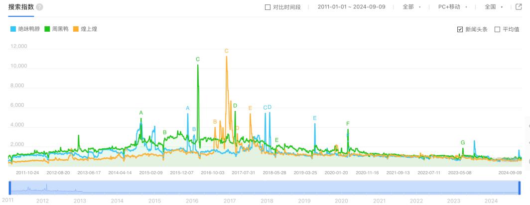 2020年之后,相关搜索指数明显下降,换言之,人们对于几大卤味巨头的关注度正在在下降。