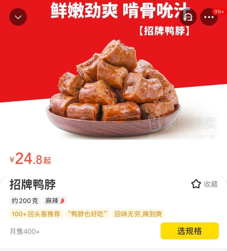 广州地区外卖平台上,200克招牌鸭脖售价为24.8元,相当于62元/斤。