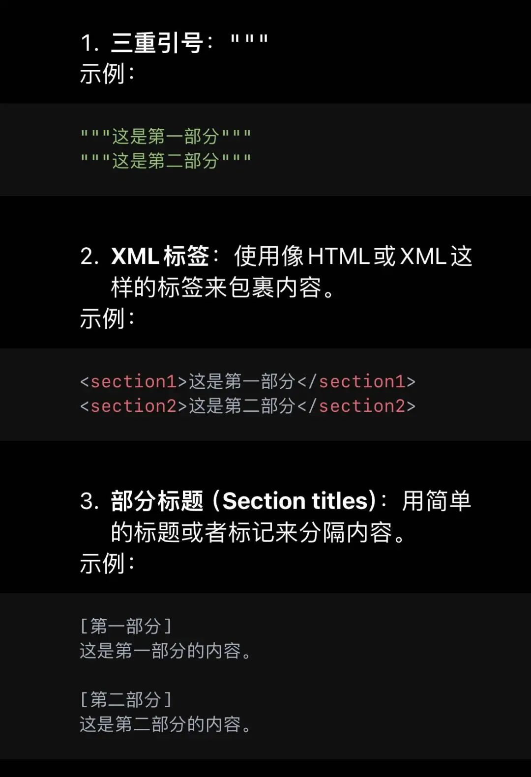 使用分隔符让提示词更加清晰:使用三引号、XML 标签、节标题等分隔符,清楚地指示输入的不同部分。