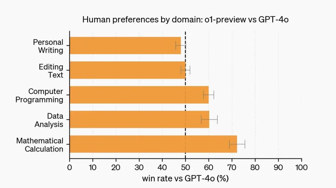 这其实也解释了,为什么 OpenAI 强调 o1 的数学、代码能力强,因为对错比较容易验证,强化学习机制能够提供明确的反馈,从而提升模型的性能。