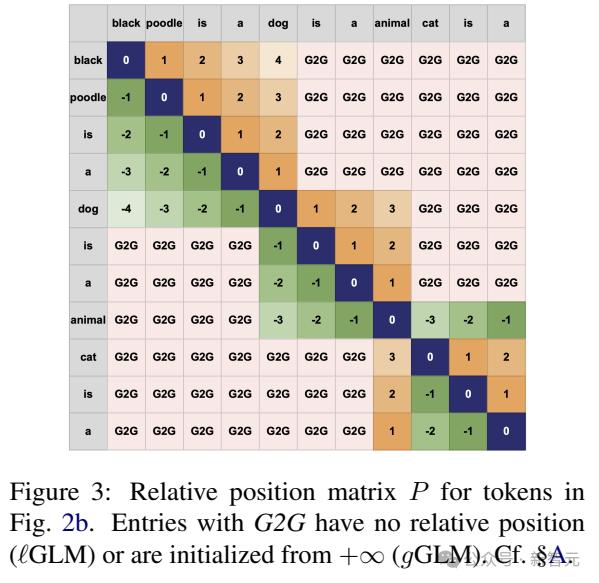 为此,全局GLM引入了新的图到图(G2G)相对位置。LM中没有学习G2G连接的参数,因此这里使用相对位置( +∞ )来初始化参数,表示相应的token出现在文本段落中很远的地方。