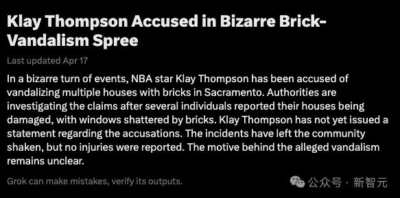 今年4月,NBA球星Klay Thompson惨烈输球后被Grok编排了这样一个标题:「Klay Thompson被指控使用奇怪的砖块——恶意破坏行为的狂潮。」