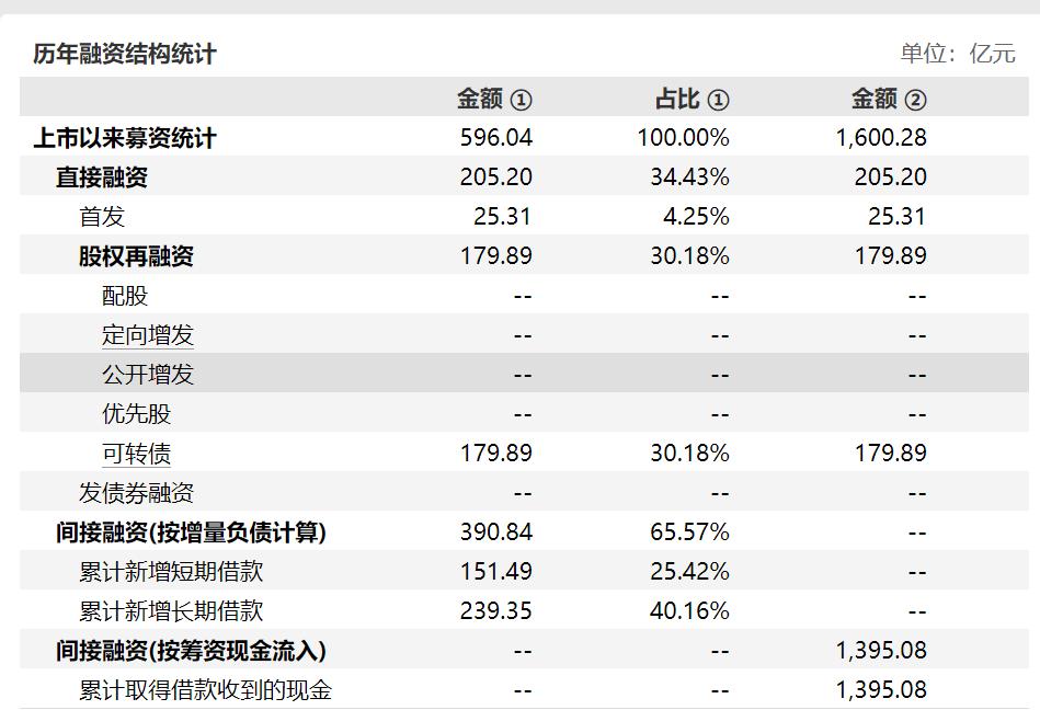 Wind数据显示,自上市以来,天合光能募资金额为596亿元,其中在资本市场通过IPO及发行可转债融资金额为205.2亿元,向银行等金融机构间接融资金额为390.84亿元。