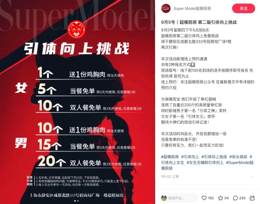 上海轻食店「Super Model超模厨房」8月营业,发起门店引体向上送轻食挑战,吸引大量健身人、攀岩人挑战,不仅在商场引起围观,还在线上赚了一大波流量,产出不少爆款笔记。除此外,环球影城功夫熊猫区的单杠挑战也声名在外,是健身人和攀岩人的团建打卡点。