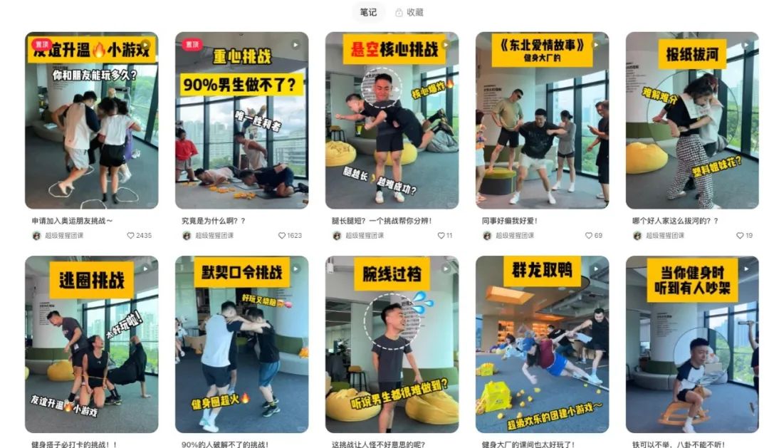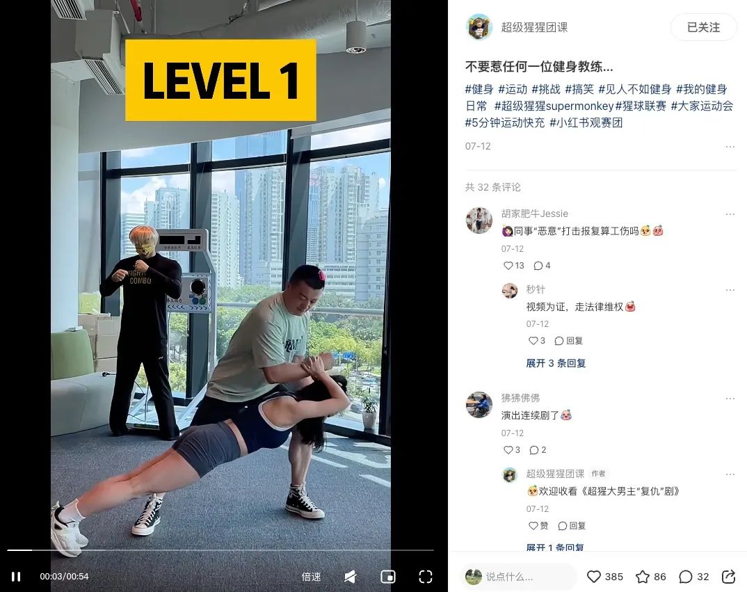 而从一个人挑战到一群人挑战,多人整活儿也激活了健身的社交属性。如果用顶级平衡加上顶级力量,整活儿效果往往是1+1大于2。比如「超级猩猩团课」,日常内容主打整活儿,灵活性挑战、核心挑战、柔韧性挑战……团队作战,失败也好看。