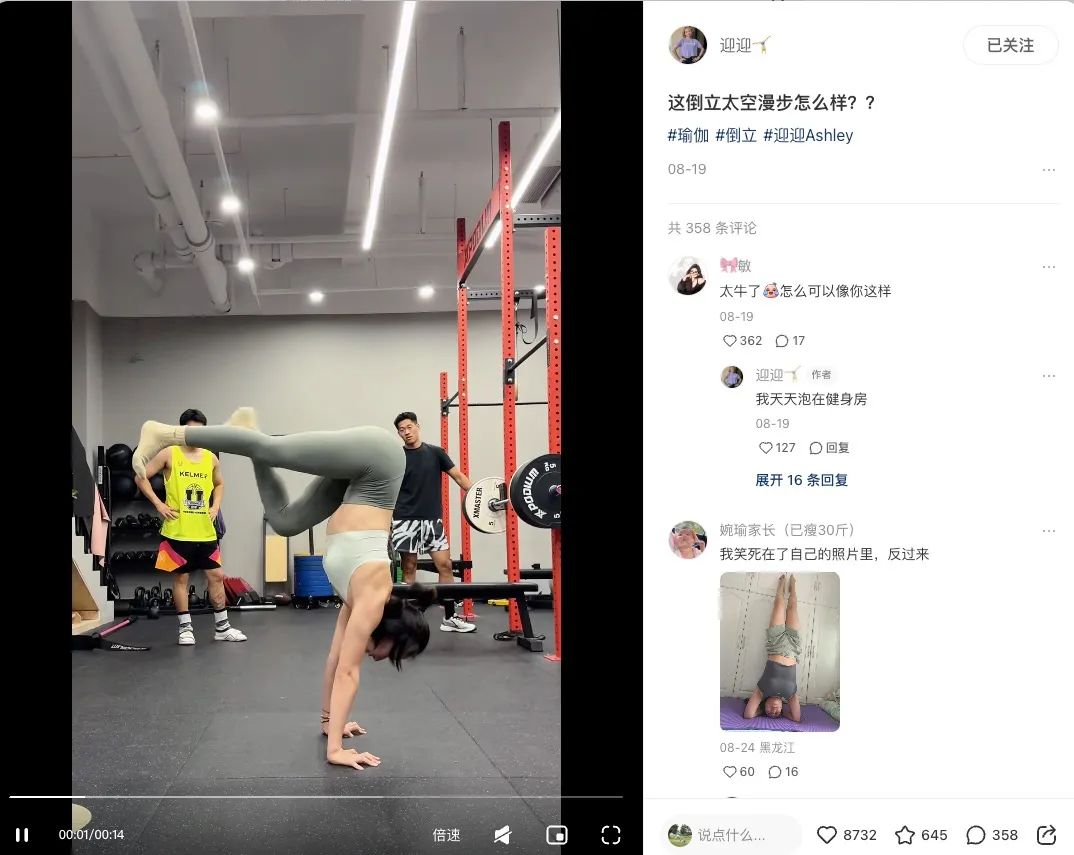 能解锁一个引体,就想尝试单臂引体、负重引体,或是前水平引体,双力臂。能完成倒立,就想在每个地方倒立,或单手倒立、倒立行走、波速球倒立,小红书上也出现了以倒立为标签的博主@迎迎,被称为全网最会倒立的整活儿博主。