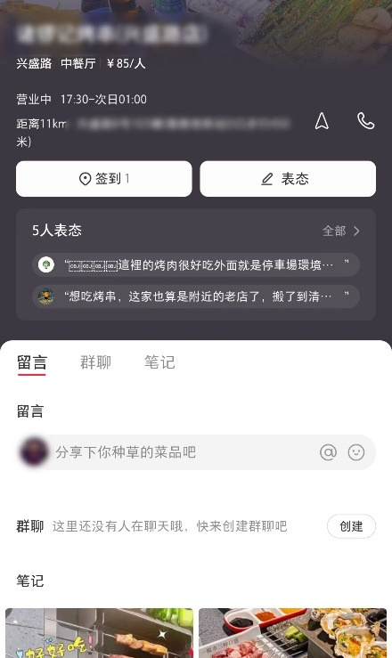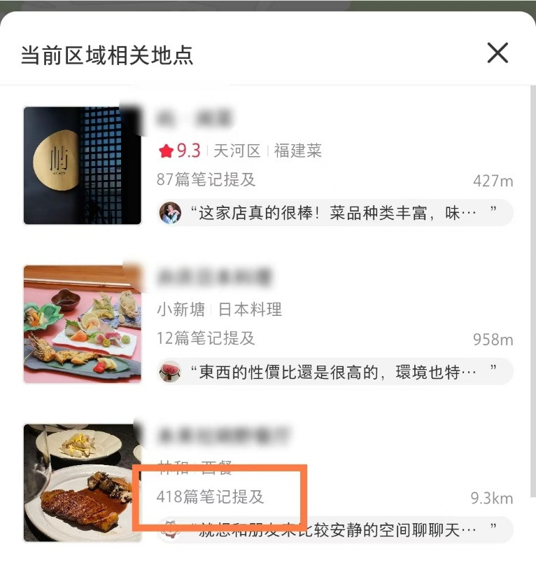 目前来看,该页面最大的功能,可能是浏览所在定位点的周边商家的相关笔记。