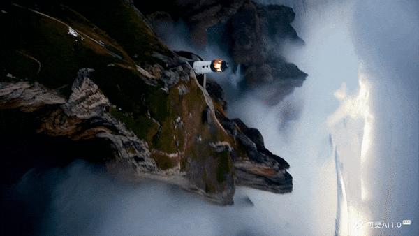 而 1.0 模型的镜头转换则更加刺激,先是一顿旋转式俯拍,接着近距离环绕拍摄,完全契合了超快速无人机拍摄的文本描述。
