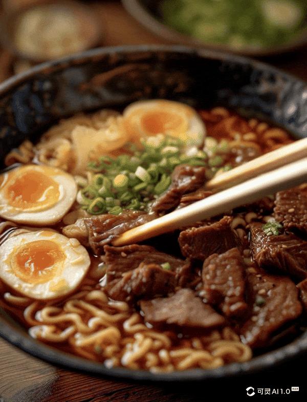 而在 1.0 模型中,对于提示词的理解就稍微欠缺一些,画面中没有出现人物,只是出现了一双筷子慢慢夹起了碗中的牛肉。