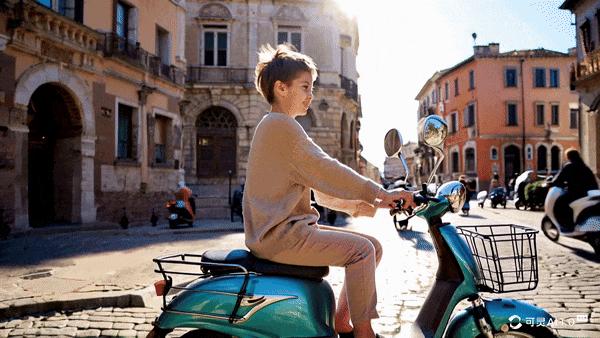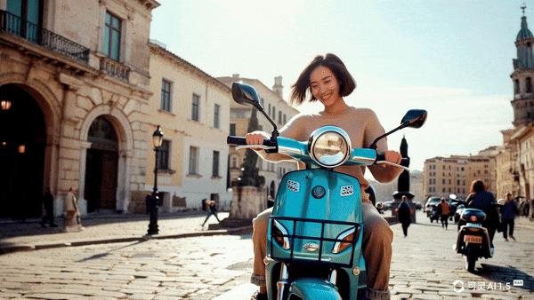 Prompt:一个短发亚洲女孩儿,穿着米色宽松毛衣,浅棕色裤子,骑着一辆罗马假日的小摩托,摩托是蒂芙尼蓝的颜色,在罗马的街头,阳光明媚,完美构图,精美画面,细节刻画,电影镜头。