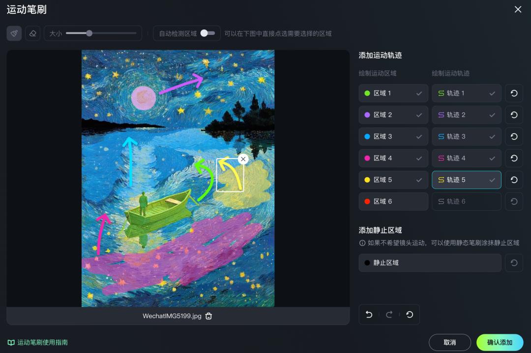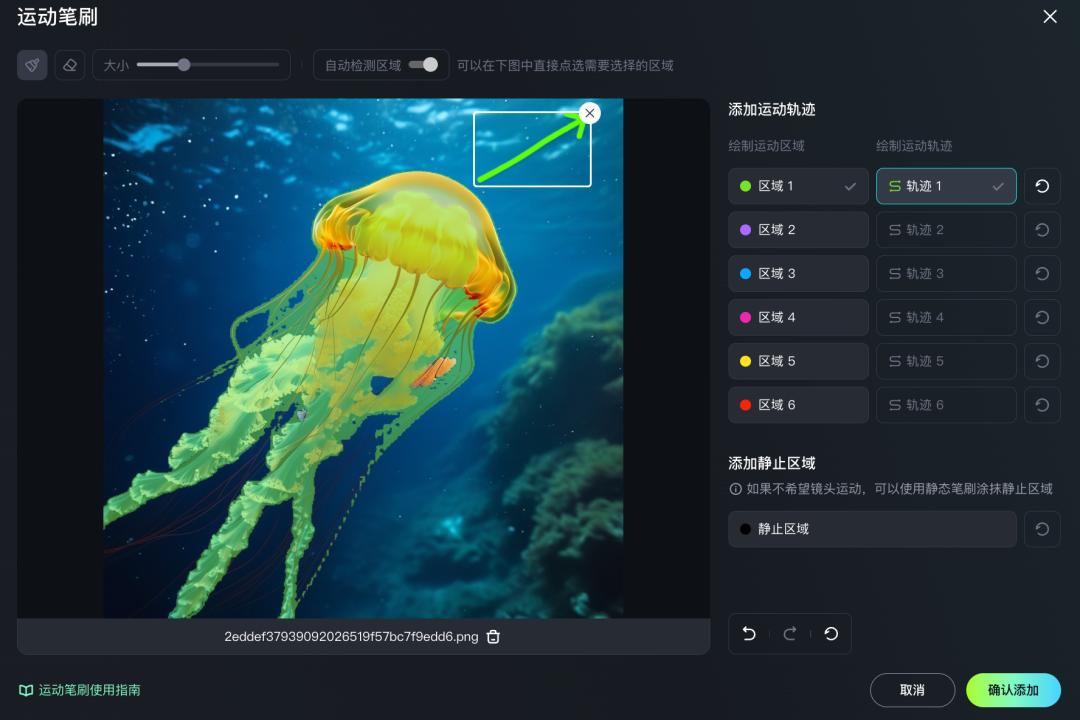 当然,我们也可以开启「自动检测区域」的按钮,让 AI 自动识别,还可以为某些元素额外指定静止区域,让视频内容有更好的运动控制及运动表现。