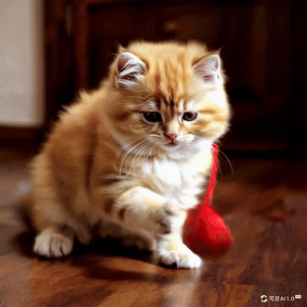 Prompt:一只毛茸茸的黄色小猫正在玩一只小小的红色毛线团。