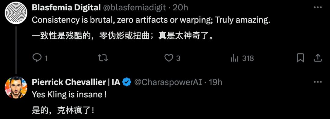 可灵 AI 的这些新功能一经推出,便吸引了全球网友前往「尝鲜」。不少网友体验后表示,这是迄今为止最好的视频生成模型,足以媲美专业电影制作的标准。