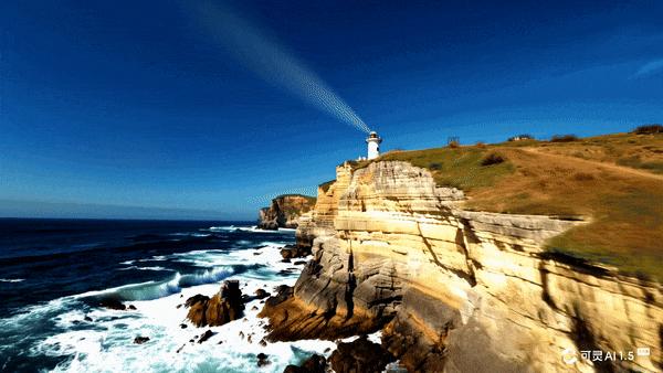 1.5 模型生成的画面更稳,镜头由远及近慢慢推进,矗立在悬崖上的灯塔还射出一道白色的亮光。