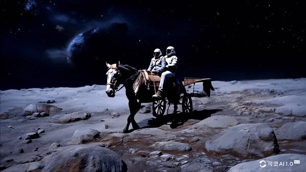 在可灵 1.0 模型中,两位宇航员乘坐的马车稍显简陋,只有一匹马、俩轮子,外加一块破布胡乱摆动。