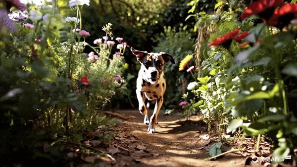 Prompt:一只花斑狗在浓密的花园中欢快地穿梭,仿佛在追逐着什么,它向前小跑着,眼睛睁得大大的,充满喜悦之情,在行走的过程中,它仔细地扫视着树枝、花朵和树叶,小径十分狭窄,花斑狗不得不在植物之间穿梭而行,画面是从地面角度拍摄的,紧跟花斑狗的步伐,提供了一个低矮而亲密的视角,画面色调温暖,颗粒感明显,给人一种电影般的视觉效果,树叶和植物上方洒落的阳光营造出温暖的对比效果,突出了花斑狗的毛发。画面清晰锐利,景深较浅。