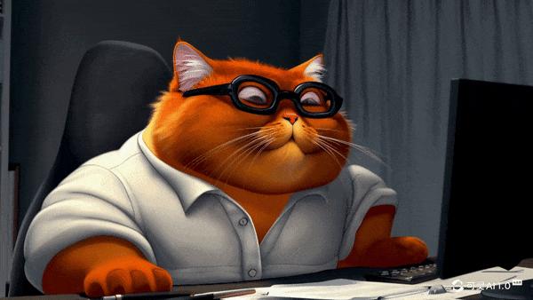 例如,我们输入 Prompt:一只拟人化的橘猫,戴着黑框眼镜,圆脑袋大肚子,穿着白衬衫,坐在电脑桌前,表情疲惫想睡觉。