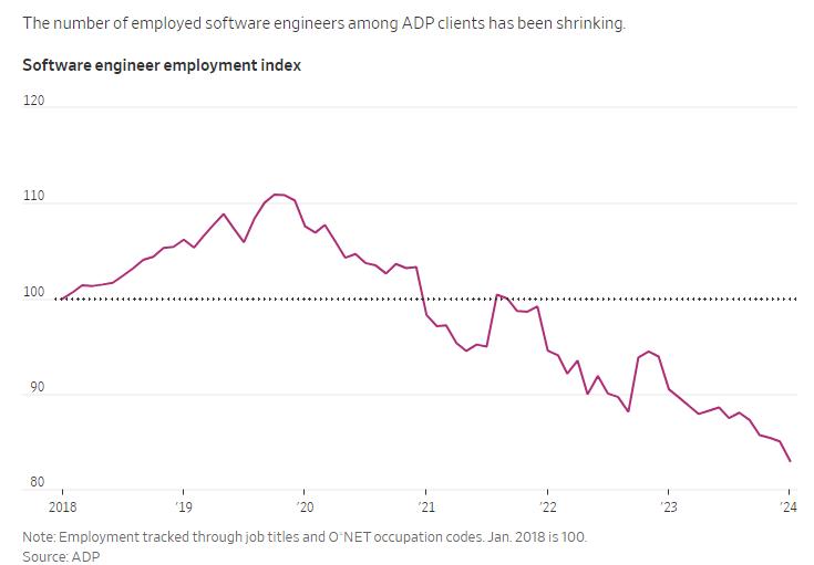 图注:软件工程师就业指数:ADP客户中雇佣软件工程师的人数始终在减少