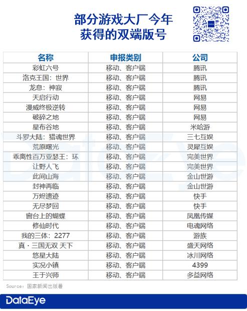 其中,腾讯、网易今年均获得了3个移动、客户端双端版号,完美世界、金山世游、快手均获得了2个双端版号。