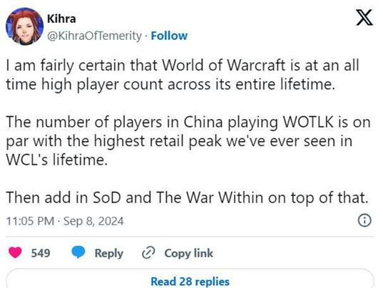 根据WLC日志管理员的推文,魔兽世界玩家超过1200万,创历史最高,核心推动力就是魔兽世界国服的回归。