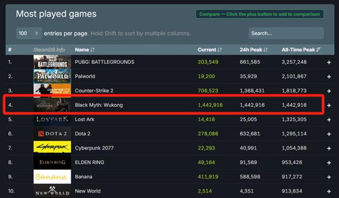 SteamDB数据显示,《黑神话:悟空》在游戏平台Steam上的同时在线人数曾突破144万,跻身Steam同时在线人数榜历史第4。