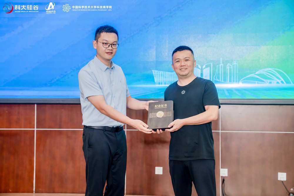 合肥市发改委场景创新处负责人赵帅为吴世春颁发科大硅谷大讲堂纪念证书