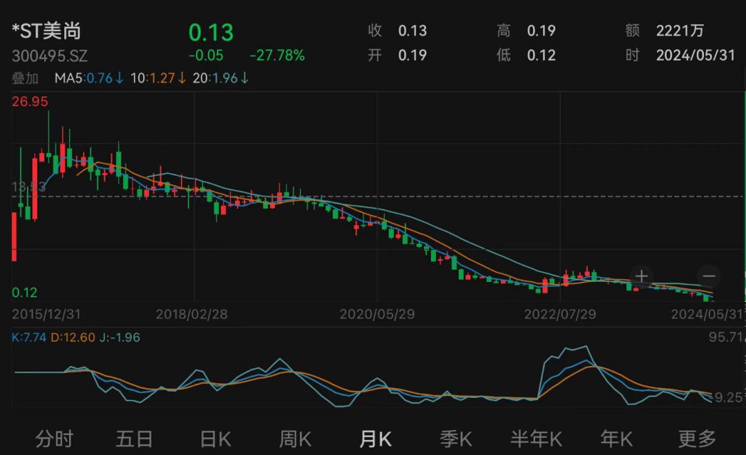 2024年9月19日晚间,*ST美尚公告称,公司股票已被深交所决定终止上市,并将于9月20日被摘牌。值得一提的是,*ST美尚退市时股价为0.13元/股,市值为8766万元。