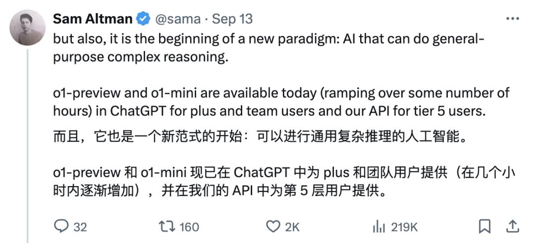 当天,Sam Altman 在社交平台上兴奋地称,「『o1』系列代表新范式的开始」。
