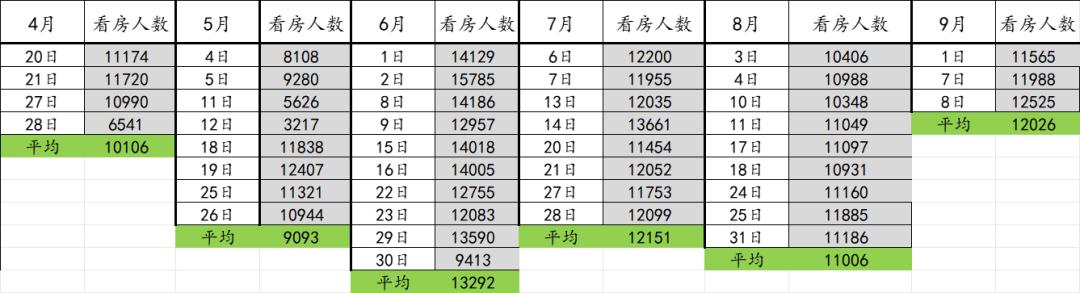 不管数据靠前靠后都不妨碍这是份可以说明市场客户的数据,这份数据最近刚刚显现出金九的味道,原本8月每周末的日均看房人数还停留在1万-1.1万,进入9月这个数据就来到1.1万-1.2万,横向对比下这个数据比8月高、比6月低,差不多3月末、4月初的水平。