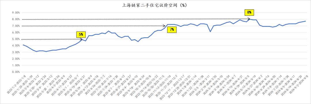 无论7%还是8%都是市场少有出现的数字,而更重要的也是这个数据的走势,我看了下从2023年首周到上周的87周的数据,从去年下半年到今年基本是不断走高的趋势,5·27新政后议价空间刹了会车,最近这个数字直到上周还是在不断走高的,大概率年底这里的7%议价空间还得 再往上走走。