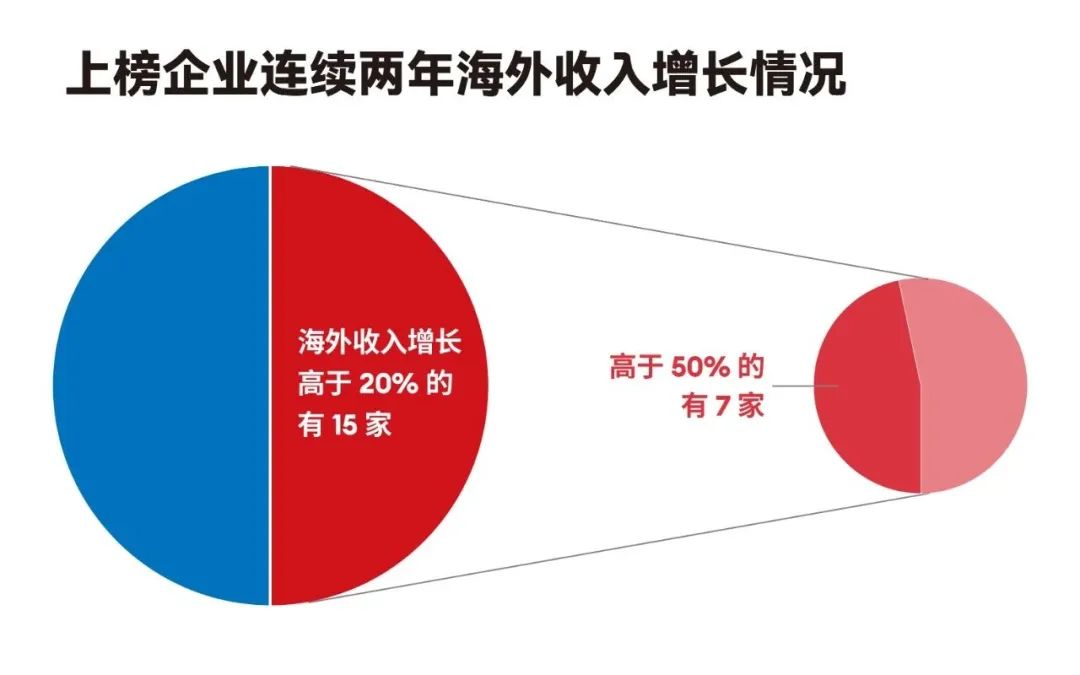 今年的榜单中,有半数企业过去两年海外收入上涨了40%,其中超过5家公司实现了海外收入的翻倍。除了显著的增长外,中国公司也正式迈入全球化经营的重要时间窗口。