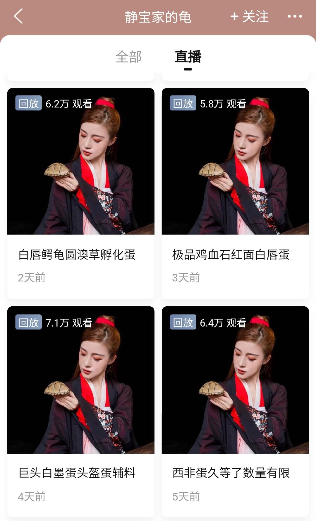 “静宝家的龟”直播封面是一个穿着红黑色长裙的美女形象,柳叶眉下的眼波停留在肩头的小乌龟身上。封面乍一看是“美女与乌龟”,但其实,直播间里的主角永远只有乌龟,水龟、蛋龟、麝香龟、孵化蛋轮番上阵。