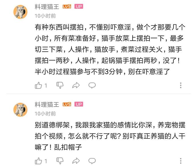 由于视频中经常会出现猫爪握刀或处理食材的镜头,有观众认为这种行为有些危险,也有人觉得卫生安全问题存在隐患,主人对此回复“半小时过程猫参与不到三分钟,别道德绑架”。