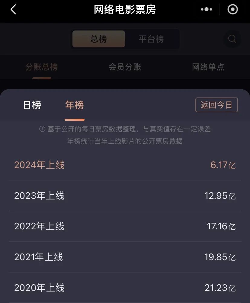 当然,千万小时网络电影的减半并不是爱奇艺一家的问题,而是整个行业几年以来颓势的延续。据云合数据,从2022年到2024年,分账破千万的网络电影数量从50部、38部一路下滑到15部,头部影片数量以及票房产出能力缩水严重,腰部作品也未能撑起大盘,而是出现了同步萎缩。2023年,云合数据网络电影分账总榜TOP 100的门槛是386万,今年已经降低到了122万。