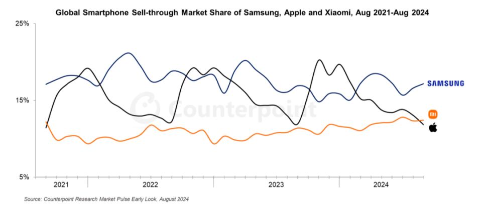 首先是苹果iPhone历来会在9月新机发布前经历季节性销售淡季。与此同时,小米虽然在8月销售量环比持平,但中国品牌也是今年上半年增速最快的品牌之一,销售量同比增速达22%。即使今年下半年的增速因基数效应放缓,该机构预期小米依然能获得“强两位数百分比”的全年增速。