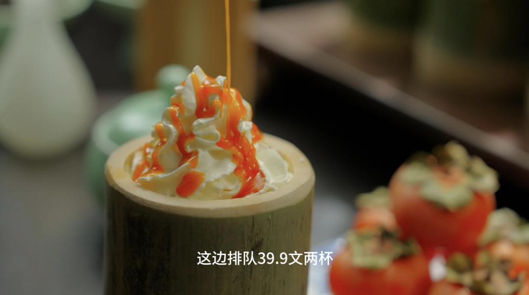 在剧中做植入时,星巴克一改往日克制形象,产品和品牌元素高频深度露出。比如在了解到女主家乡特产后,男主角将现代特调思路挪用到古代,开发出火晶柿子、柚子、栗子为基底的饮品;科考在即,星巴客栈推出“第二杯免费”活动,并把好彩头写到杯上,助力备考,正呼应了现代的营销玩法。